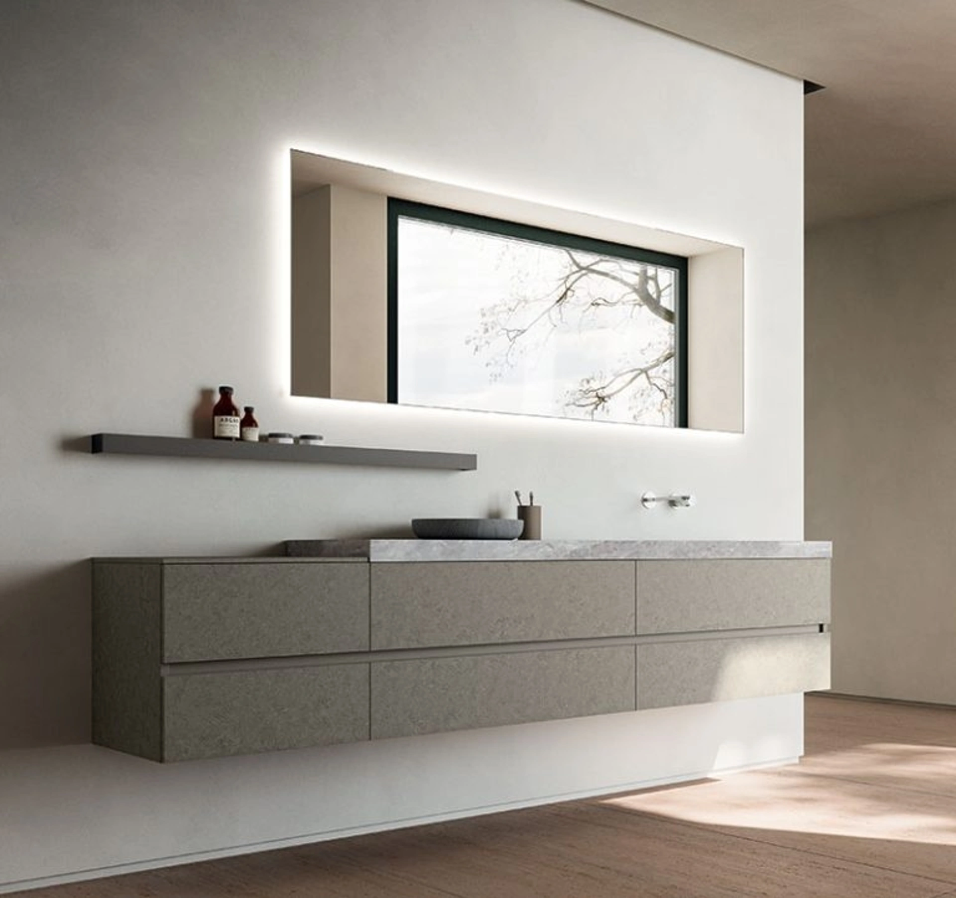 Arreda il tuo bagno moderno alla perfezione con Segno 01, mobili bagno sospesi e accessori in melaminico di Cerasa.