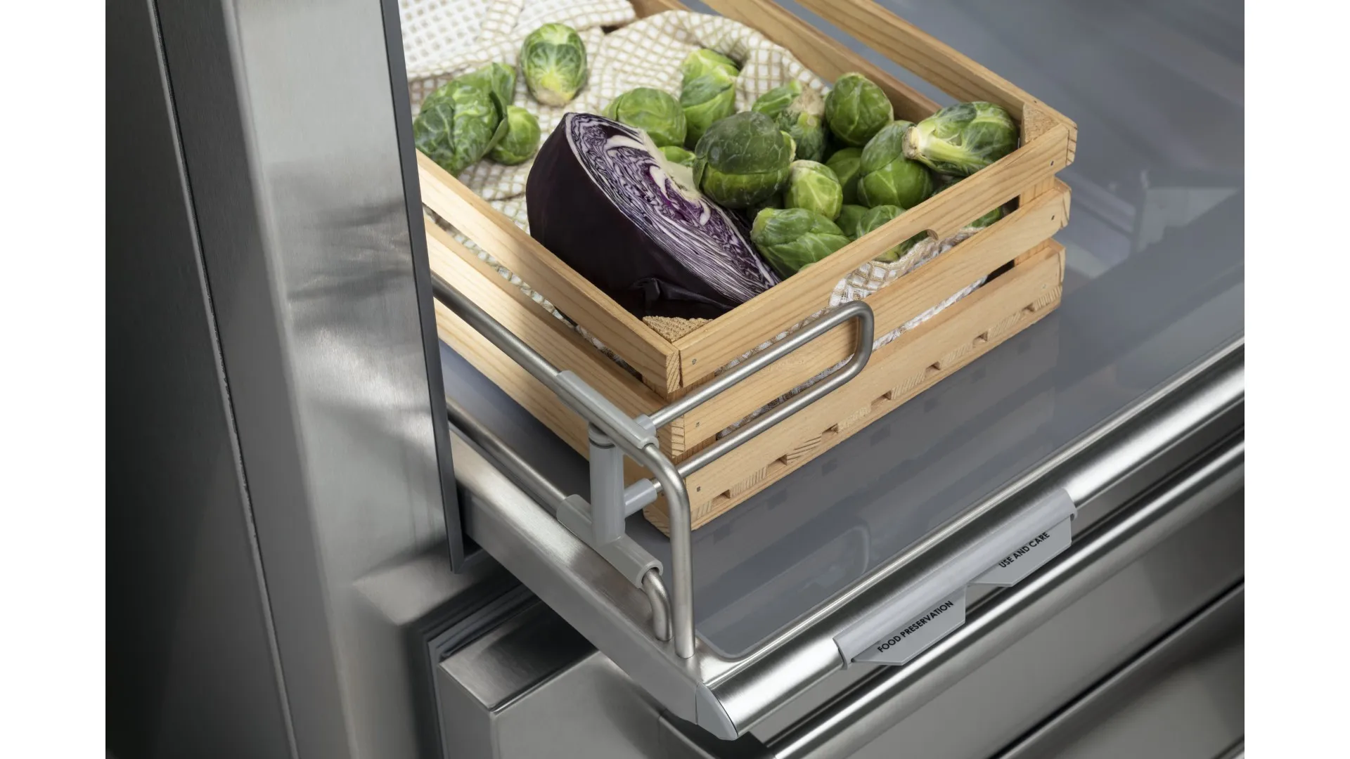 Il cassetto superiore con coperchio in vetro, è dotato di una speciale chiusura per mantenere alto il livello di umidità
