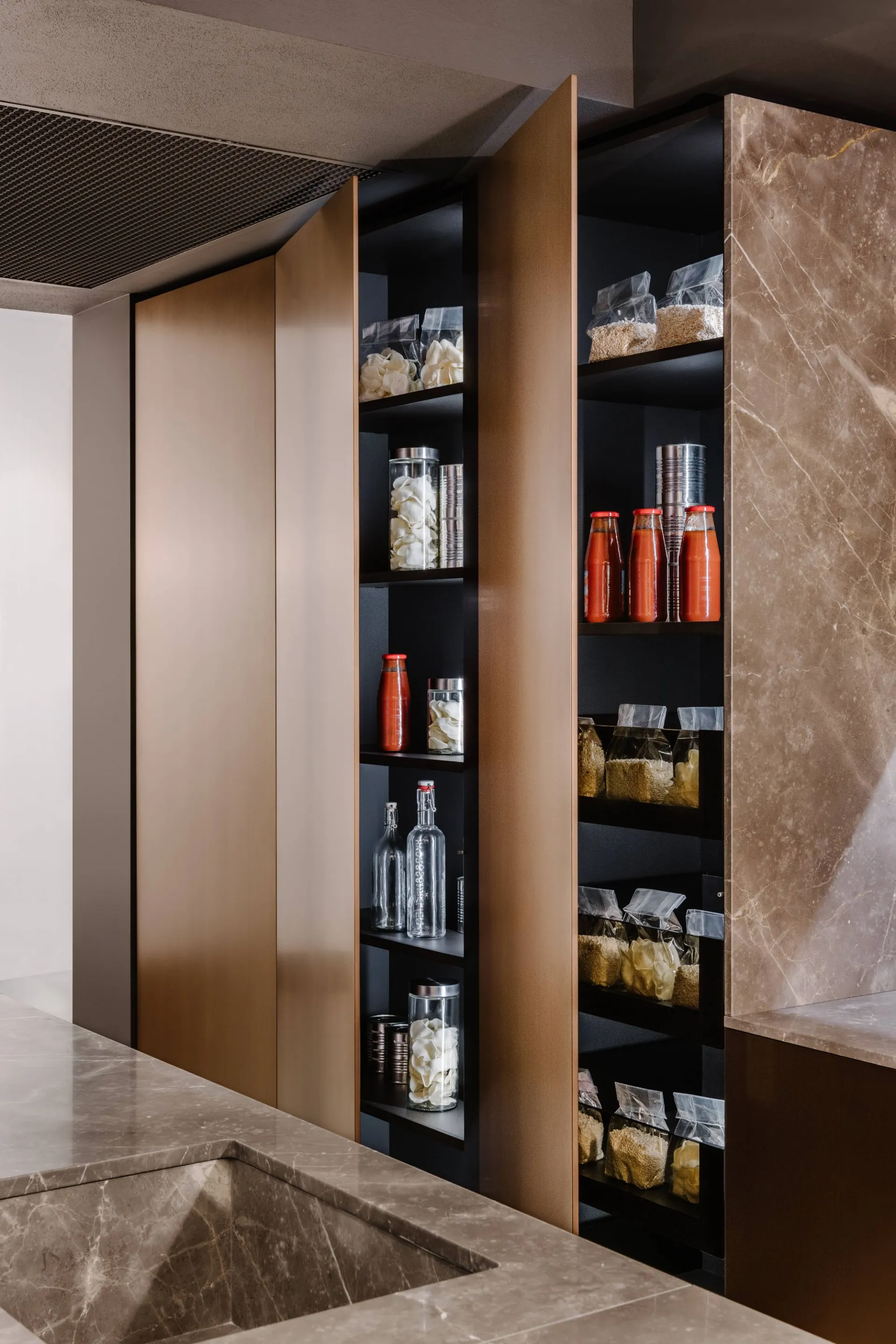 Il marmo Collemandina dona con le sue striature di bianco un dinamismo classico che unito alla rigorosità delle ante laccate crea un equilibrio perfetto in cucina.